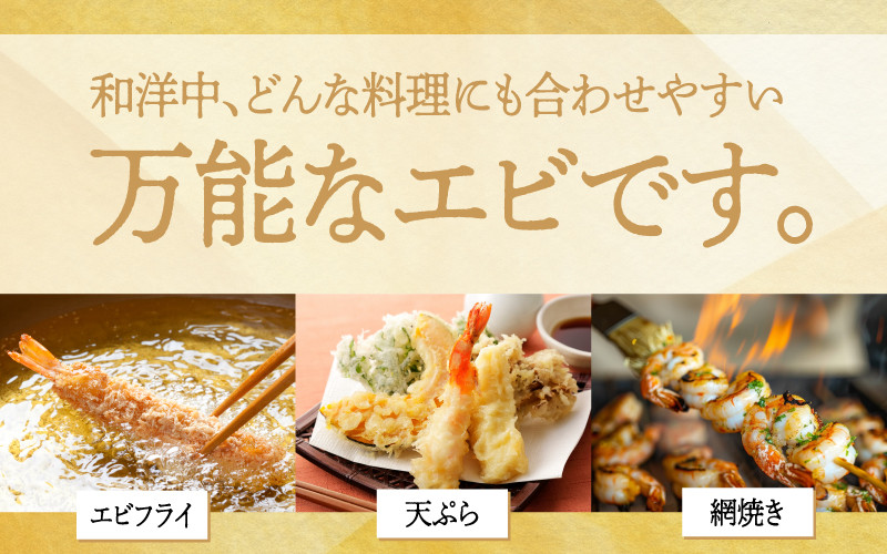 どんなエビ料理にも最適です。BBQなどの網焼きやボイル、エビフライ、酢の物、しゃぶしゃぶやサラダにもおすすめです。