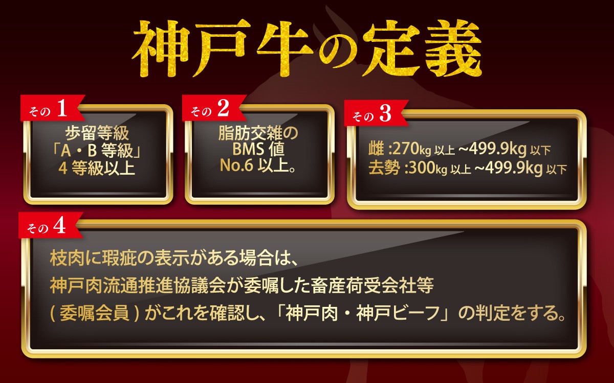 敷居が高く思われている神戸牛を、幅広い方に楽しんでいただきたく、 今回はお試し用として製品開発を行いました! ぜひ神戸牛の美味しさをご堪能いただけると大変嬉しいです。 ●神戸牛とは 「神戸牛」とは、兵庫県産の※但馬牛(たじまうし)を兵庫県内の指定農家で肥育し、非常に厳しい基準を全てクリアしたものだけが「神戸牛」になります。 その神戸牛の赤身スライス200g・切り落とし200gの計400g入れてお送りします。ご家庭・贈答用に美味しくお召し上がり下さい。 ※但馬牛(たじまうし)とは、明治36 年の牛籍台帳以来、兵庫県内で厳正な個体管理や育種改良を進めてきた牛です。 そのうち一定の枝肉格付けのものが神戸ビーフと呼ばれます。 ●神戸牛の定義 ①「A」・「B」4等級以上とする。 ②脂肪交雑のBMS値No.6以上とする。 ③雌は、270kg以上から499.9kg以下とする。 去勢は、300kg以上から499.9kg以下とする。 ④枝肉に瑕疵の表示がある場合は、本会が委嘱した畜産荷受会社等(委嘱会員)がこれを確認し、「神戸肉・神戸ビーフ」の判定をする。
