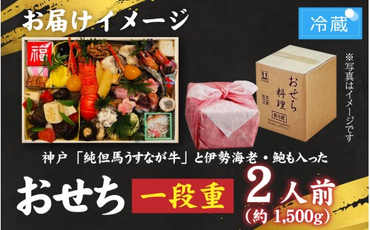 容量 | ■神戸「純但馬うすなが牛」と伊勢海老・鮑も入った贅沢おせち 2人前・一段重・約1,500g ※厳選した自然素材を使用し、保存料無添加のため直射日光を避け5℃以下で保存してください。 |