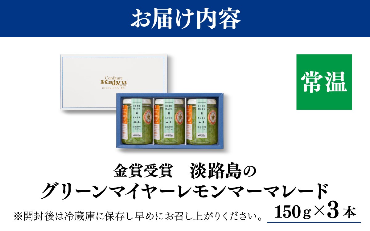 | 容量 | ◆商品内容◆ 「淡路島のグリーンマイヤーレモンマーマレード」 150g × 3本セット 箱入 |