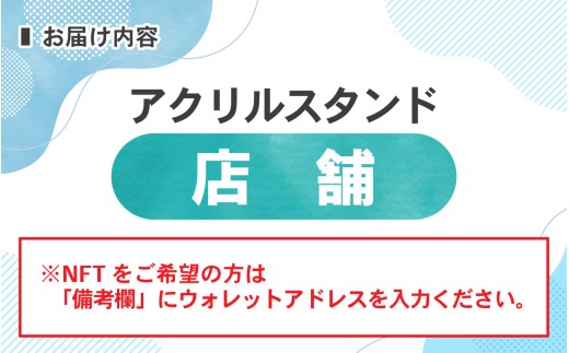 容量 | ■内容 ・店舗アクリルスタンド(75mm×75mm) 1個 ・店舗サポーターNFT(ご希望の方のみ) |
