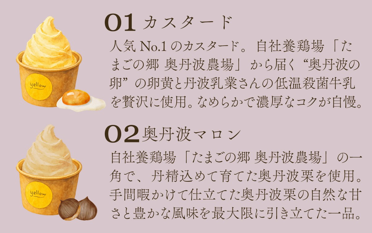 自社養鶏場でとれた新鮮でこだわりの卵「奥丹波の卵」と丹波産のノンホモ低温殺菌牛乳をメインに仕上げた、たまごやさんのカスタード味をはじめ、兵庫県産こだわりの原料をたっぷりと配合し濃厚で贅沢なジェラートをラインナップ。 地産地消、地域貢献を大切に食材を選定しています。 本場イタリア製のジェラートマシンで製造したなめらかな口当たりのジェラートに仕上げています。殺菌、冷却、冷凍までオールインワン製造。製造ごとに自社品証検査室で検査を実施したジェラート製造しています。