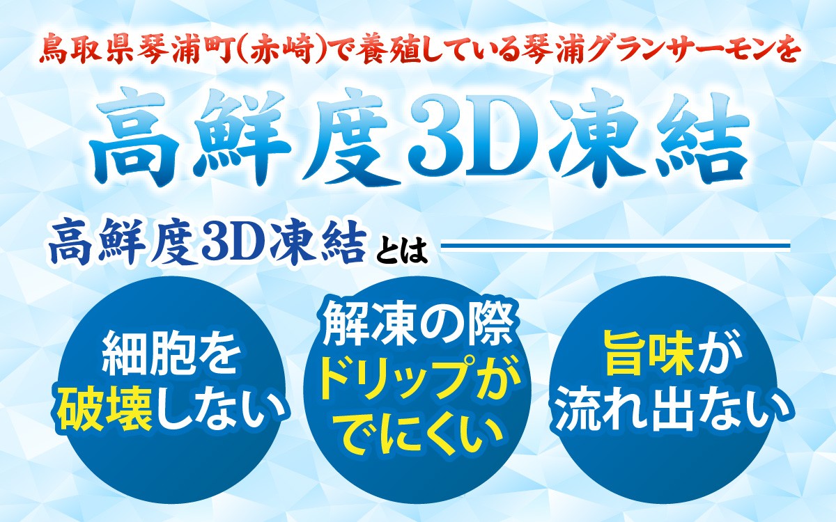 鳥取県琴浦町(赤崎)で養殖している「琴浦グランサーモン」をお刺身用に高鮮度3D凍結しております。解凍時にドリップがほとんど出ませんので、美味しくお召し上がりいただけます。