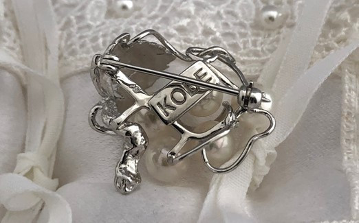 アコヤ真珠をぶどう一粒一粒に見立てたデザインのブローチです。ロゼワインを想像させるほんのりピンク系の珠を使用しており、裏面には「KOBE」の刻印を入れております。
