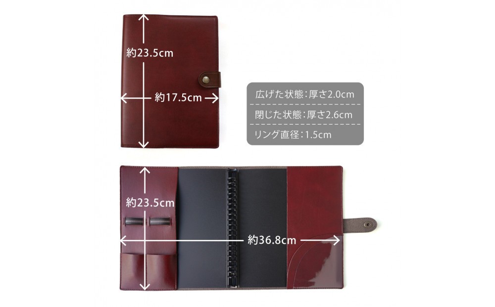 | 容量 | 【カラー】 ブラウン、カーキ、ダークレッド、キャメル、ブラック 【サイズ】 バインダーのサイズ 縦22.5cm×横16.5cm×背巾2cm、A5サイズ、20穴 【素材】人工皮革 製造場所/神戸市長田区  |