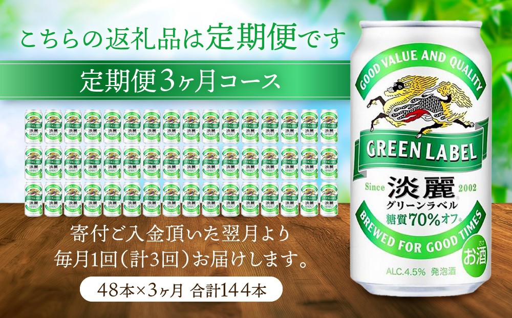 <キリンビール3ヵ月定期便>キリン淡麗 グリーンラベル350mL缶 毎月2ケース(24本×2)×3ヵ月