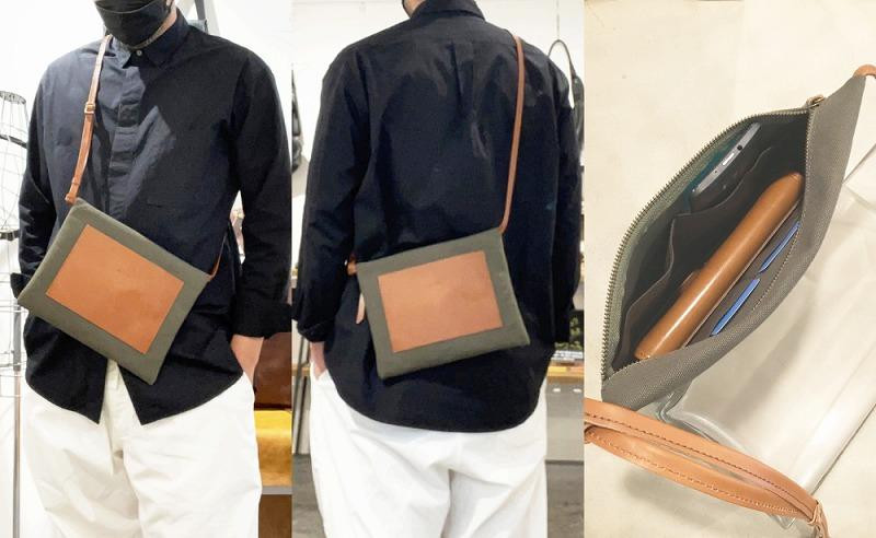 6号帆布の本体にシュリンク型押しを施したオイルヌメレザーのスクエアポケット。