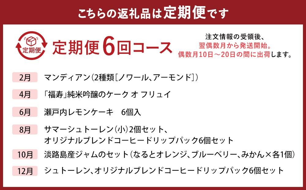 | 容量 | 【2月】マンディアン(2種類[ノワール、アーモンド]) 【4月】「福寿」純米吟醸のケーク オ フリュイ 【6月】瀬戸内レモンケーキ 6個入 【8月】サマーシュトーレン(小)2個セット、オリジナルブレンドコーヒードリップパック6個セット 【10月】淡路島産ジャムのセット(なるとオレンジ、ブルーベリー、みかん×各1個) 【12月】シュトーレン、オリジナルブレンドコーヒードリップパック6個セット |