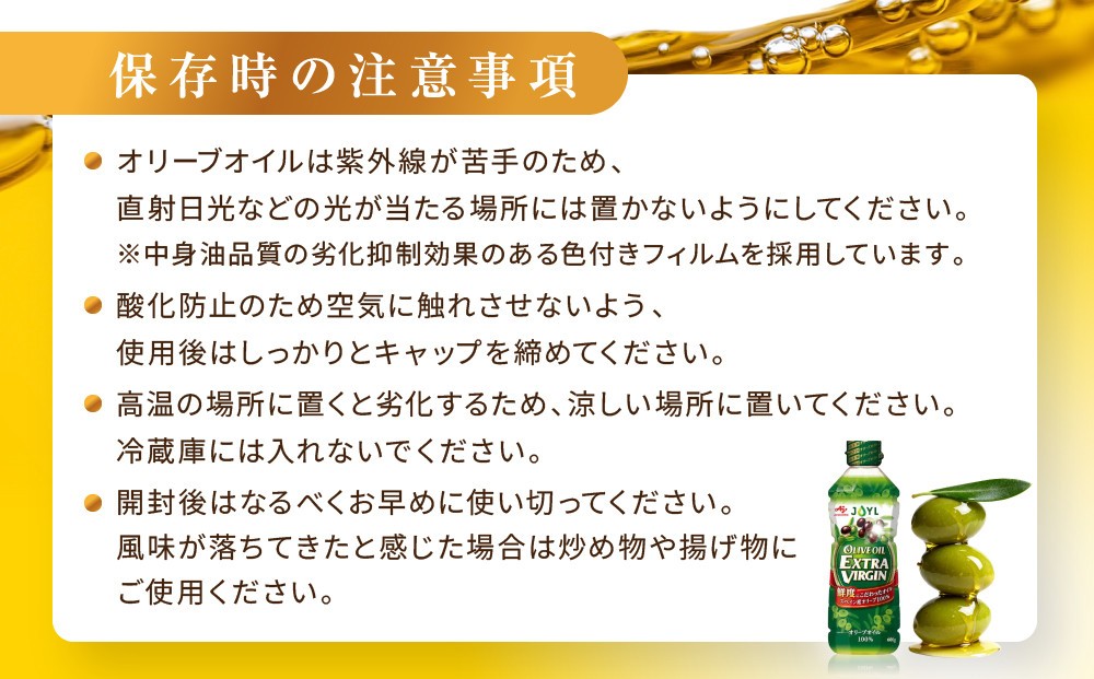「JOYL 味の素 オリーブオイル エクストラバージン」は、世界最大のオリーブオイル生産地であるスペインの指定農園オリーブオイルを100%使用。国際オリーブ協会(本部スペイン)の基準より厳しい、独自基準の酸度0.3%以下のオリーブオイルだけを厳選しています。できるかぎり鮮度が良い状態でお客様にお楽しみ頂くために、空気に触れないよう日本まで輸送し、品質管理の行き届いた国内工場で酸化を防ぐ独自製法(製法特許出願済)を経てボトルに充填しています。オリーブオイル特有の苦み・辛味が強すぎないフルーティな味わいが特長。