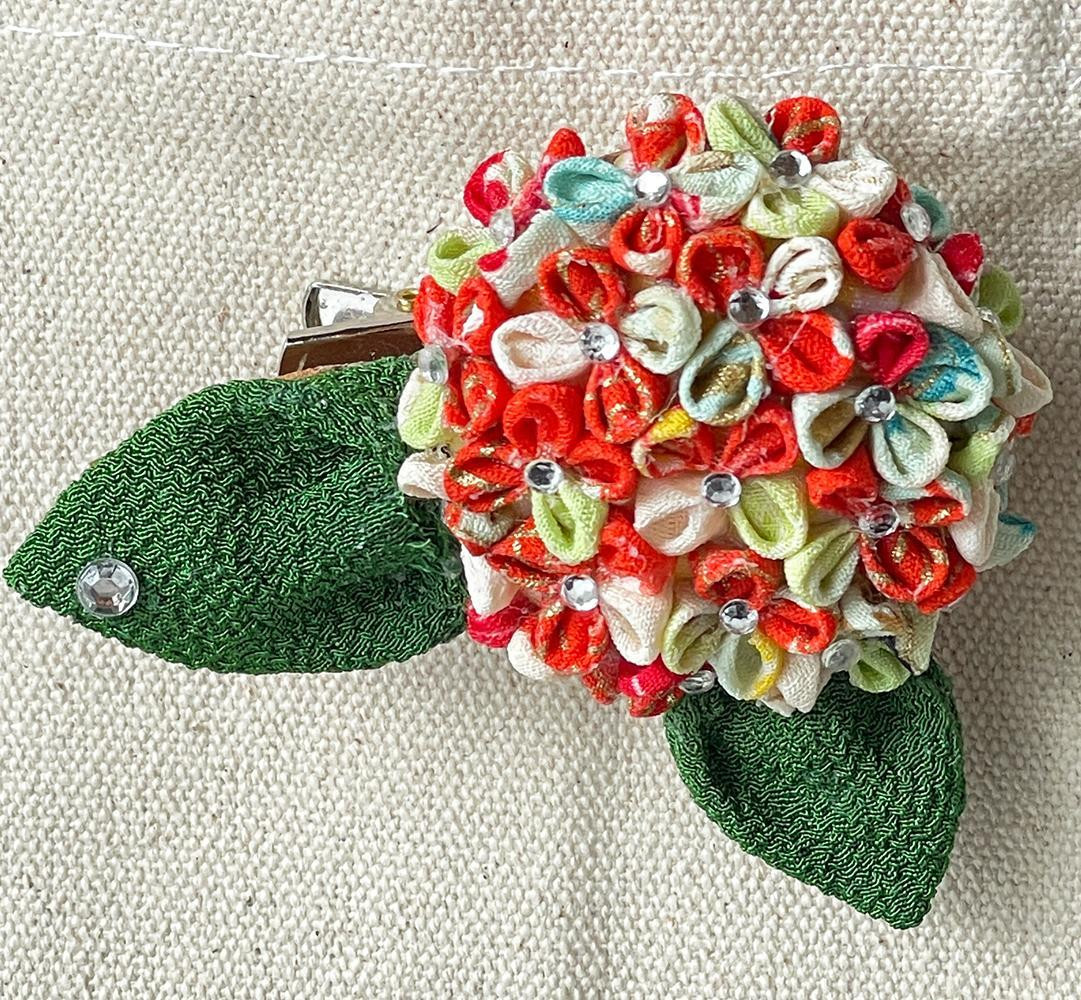 紫陽花の花をモチーフに、華やかな色合いで仕上げられたつまみ細工が特徴です。