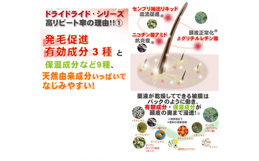ドライドライド コンフォートを気になる部分にスプレーすると、発毛を促す3つの有効成分(センブリ抽出リキッド・β-グリチルリチン酸・ニコチン酸アミド)が頭皮に浸透(※)します。その後、その他成分は乾燥して超耐水性の被膜に変化し、あなたの産毛、細毛をそっと覆うように包み込んで発毛促進します。細い毛髪は健康な髪と同じように太く、見えるようになるので、これから成長していく産毛や細毛の存在を自覚しながら発毛促進することができるのです。