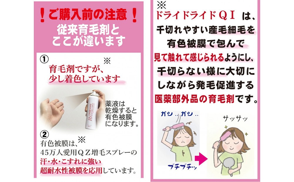 今までにない発毛促進の感激をあなたに! 千切れやすい産毛・細毛も見える・触れて感じられるようになるから 無意識にダメージを与えてしまう事なく大切に育毛、脱毛を防ぎ発毛促進できます! 本育毛剤の薬液は有効成分浸透後(角質層まで)、乾いて産毛・細毛を包む被膜になります。 商品名:【医薬部外品】育毛剤 ドライドライド QZ-3D 120mL 日本製 事業者名:Re&Do株式会社 連絡先電話番号:078-201-8011 【関連キーワード】 美容 ヘアケア スタイリング 髪 洗浄 人気 石鹸 散髪 はさみ シャンプー トリートメント ヘアオイル 医薬部外品 育毛 発毛 促進剤 神戸市 ヘアカット ケア スカルプケア 頭皮ケア ヘアスタイル 乾燥対策 保湿 人気 おすすめ 送料無料