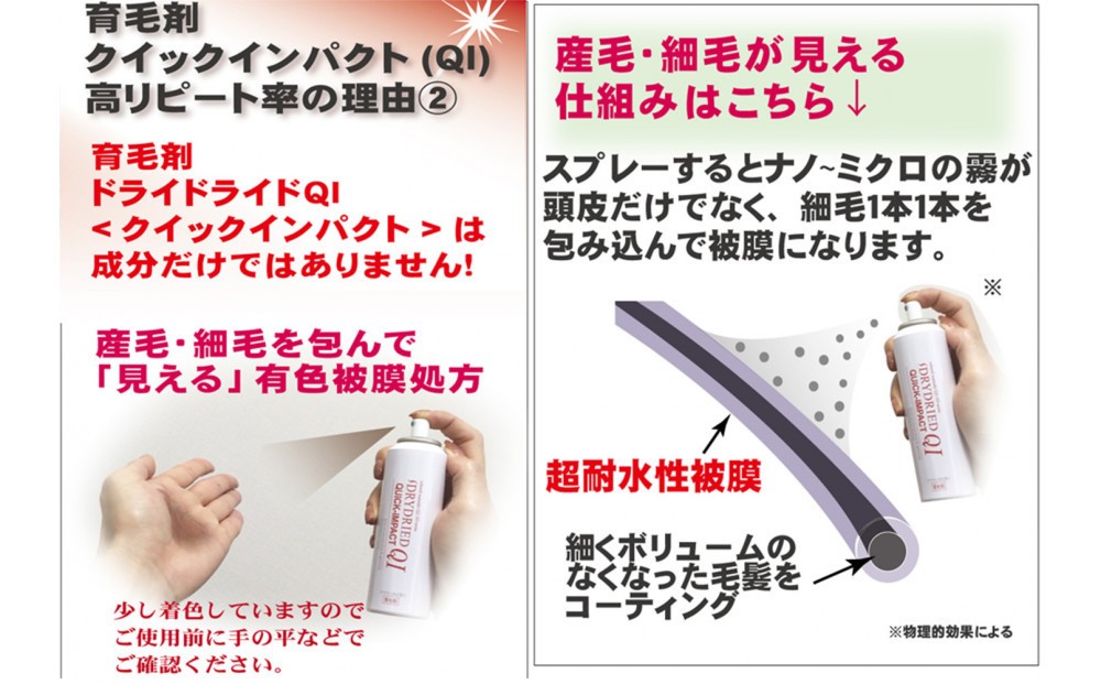 今までにない発毛促進の感激をあなたに! 千切れやすい産毛・細毛も見える・触れて感じられるようになるから 無意識にダメージを与えてしまう事なく大切に育毛、脱毛を防ぎ発毛促進できます! 本育毛剤の薬液は有効成分浸透後(角質層まで)、乾いて産毛・細毛を包む被膜になります。 ・本品は育毛剤であり、ヘアカラーや増毛剤等ではありませんが、少し着色しています。今まで着色料(増毛スプレーなど)を使用したことのない方や、一般的な育毛剤しか使用したことがないという方へ。驚くほどインパクトのある使用感です。初めてお使いの際には、説明書をよくお読みになってからご使用ください。 ・育毛の有効成分×人工被膜のWアプローチで効率的な育毛を実現。 ・爽快感のある速乾性のスプレータイプ。液だれもなく使いやすいサラサラの使用感。 ドライドライド クイックインパクトを気になる部分にスプレーすると、発毛を促す3つの有効成分(センブリ抽出リキッド・β-グリチルリチン酸・ニコチン酸アミド)が頭皮に浸透(※)します。その後、その他成分は乾燥して超耐水性の被膜に変化し、あなたの産毛、細毛をそっと覆うように包み込んで発毛促進します。細い毛髪は健康な髪と同じように太く、見えるようになるので、これから成長していく産毛や細毛の存在を自覚しながら発毛促進することができるのです。 ※角質層まで 商品名:【医薬部外品】育毛剤 ドライドライド クイックインパクト 120mL 日本製 事業者名:Re&Do株式会社 連絡先電話番号:078-201-8011 【関連キーワード】 美容 ヘアケア スタイリング 髪 洗浄 人気 石鹸 散髪 はさみ シャンプー トリートメント ヘアオイル 医薬部外品 育毛 発毛 促進剤 神戸市 ヘアカット ケア スカルプケア 頭皮ケア ヘアスタイル 乾燥対策 保湿 薄毛 円形脱毛
