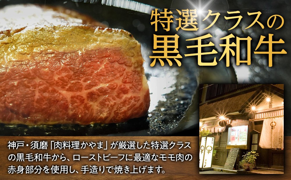 神戸・須磨「肉料理かやま」が厳選した特選クラスの黒毛和牛から、ローストビーフに最適なモモ肉の赤身部分を使用し、手造りで焼き上げます。