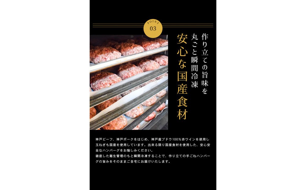 柔らかく、甘み豊かな神戸ポークを100%使用し、神戸ワインをブレンドしたハンバーグです。