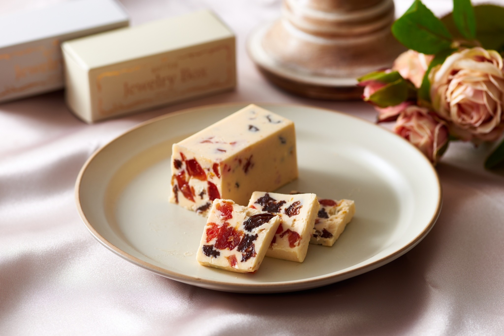 Jewelry Boxの原点である優しい味わいのレーズンは、ブランデーに漬込みフランベしています。この味を大切にしたいという想いから、あえてドライトマトをラム酒にじっくりと漬込みました。まろやかな甘さのレーズンと、ラム酒が華やかに香るドライトマトが織りなす絶妙なハーモニーです。濃厚ながらくどさのない独自のバターベースが、二つの個性を優しく包み込み、一口ごとに深い味わいです。見た目にも鮮やかなドライトマトが彩りを添える、まさに大人のための特別な一品です。