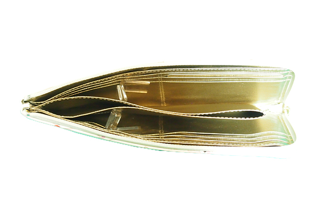 大きく開いてカードも多数収納できます。12箇所のカードポケットと3箇所のフリーポケットがあります。