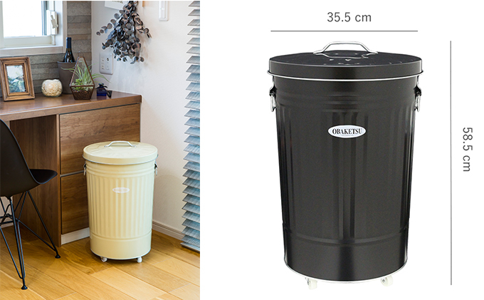 「一生モノのバケツ」をコンセプトに、大正時代から続く姫路城近くのバケツ工場で職人が手作りする【OBAKETSU(オバケツ)】のダストボックス。純日本製トタン素材なのでサビに強く、屋外でも使用できます。フタにフックが付いていて本体に引っ掛けられます。表面は使い込むほどに味わい深くレトロ感が増します。キャスター付で移動もラクラク。