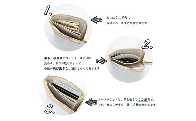お札は2つ折りで収納でき、牛革一枚取りのコインケース部分では、見やすい開口で取り出しやすくも小銭がお財布の中で散乱しないよう設計しております。