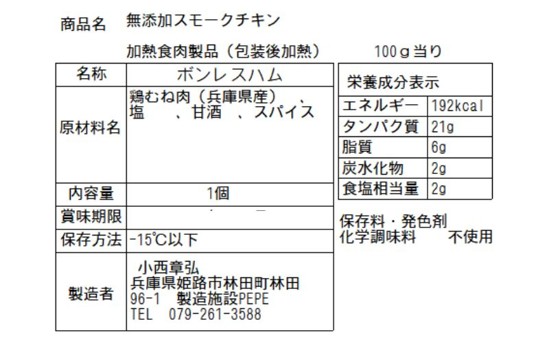 | 容量 | 兵庫県産!!完全無添加手作り但馬鶏スモークチキン300g前後×3個 ※真空包装 |