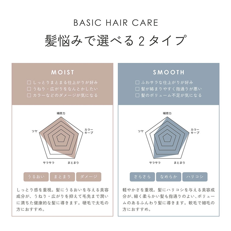 髪にハリコシを与える「アルガンオイル」や、「ツボクサエキス」などをバランス良く配合することで、毛髪内部からの水分蒸発を防ぎ、細く柔らかい髪も指通りのよい、ボリュームのあるふんわり髪へ導きます。