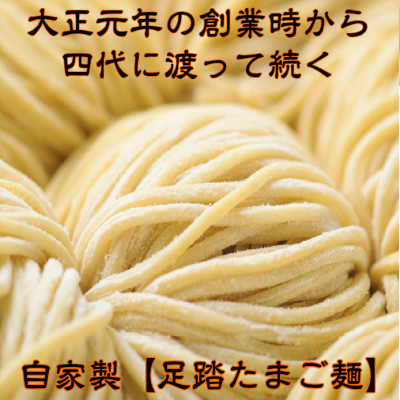 大正元年の創業当時より四代に渡り受け継いできました『足踏み製法』による自家製麺は一般的な製法に踏み込み作業を加えた昔ながらの製法です。親子四代約110年、代は変われど流儀は変わらず細々ながら脈々と独自の製法を継承してきました。