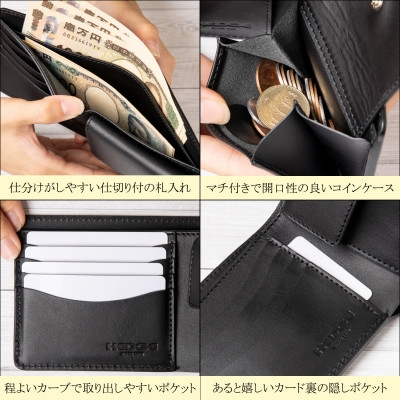 仕切り付の札入れやマチ付きの小銭入れ、カード裏の隠しポケットなど「使いやすい」を詰め込んでいます。