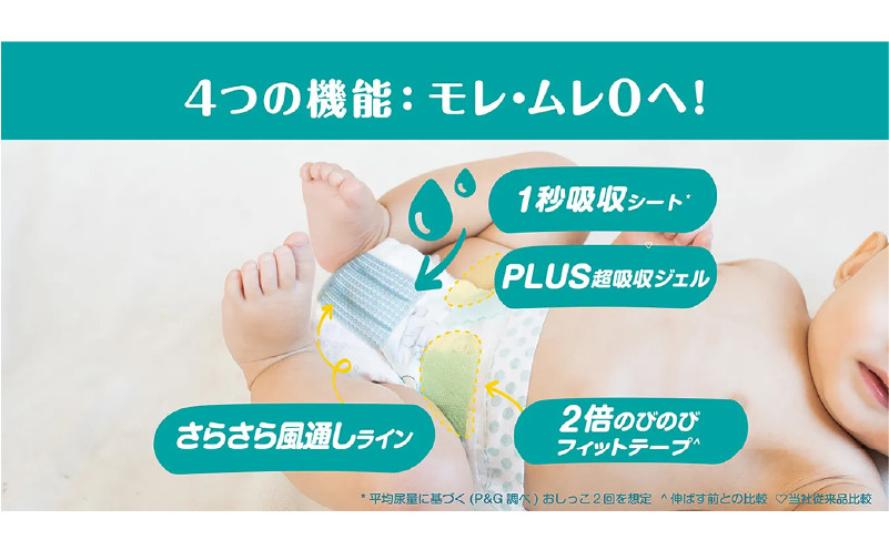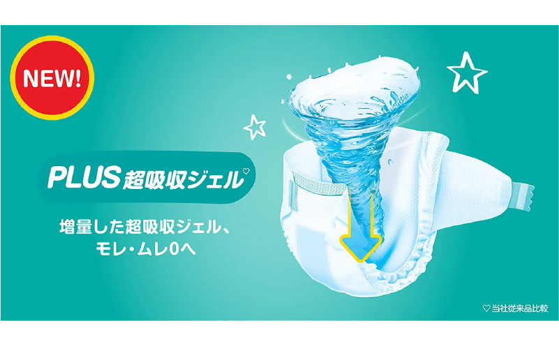 新パンパースは吸収ジェルを約120%増量(※1)、モレの発生が半減に。