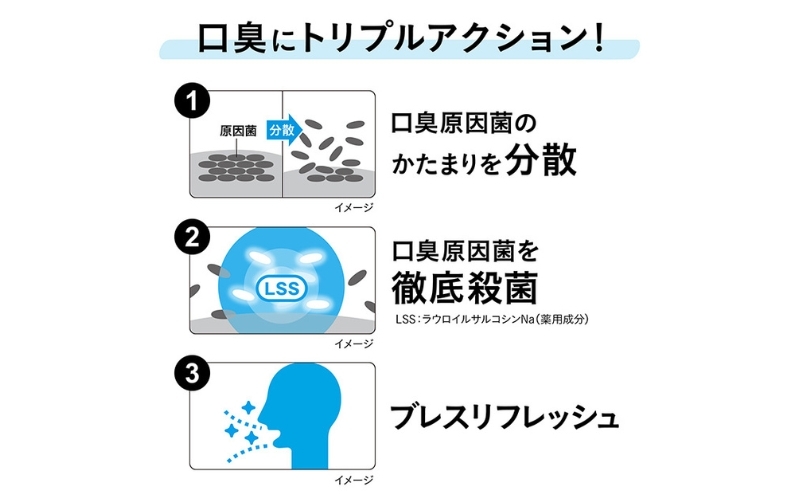 (2)殺菌成分LSS(ラウロイルサルコシンNa)が口臭原因菌を徹底殺菌し、口臭の発生を防ぎます。