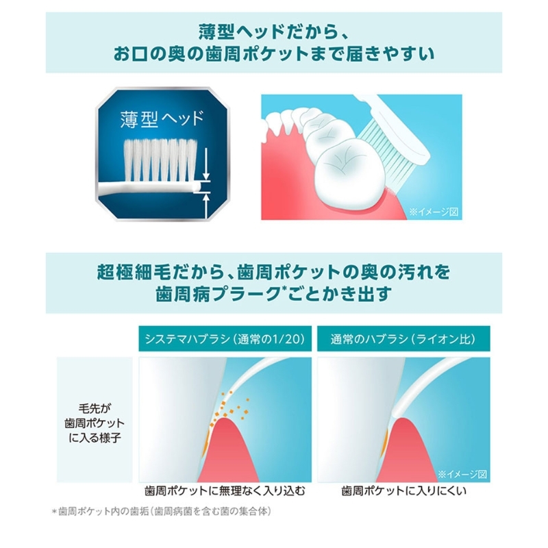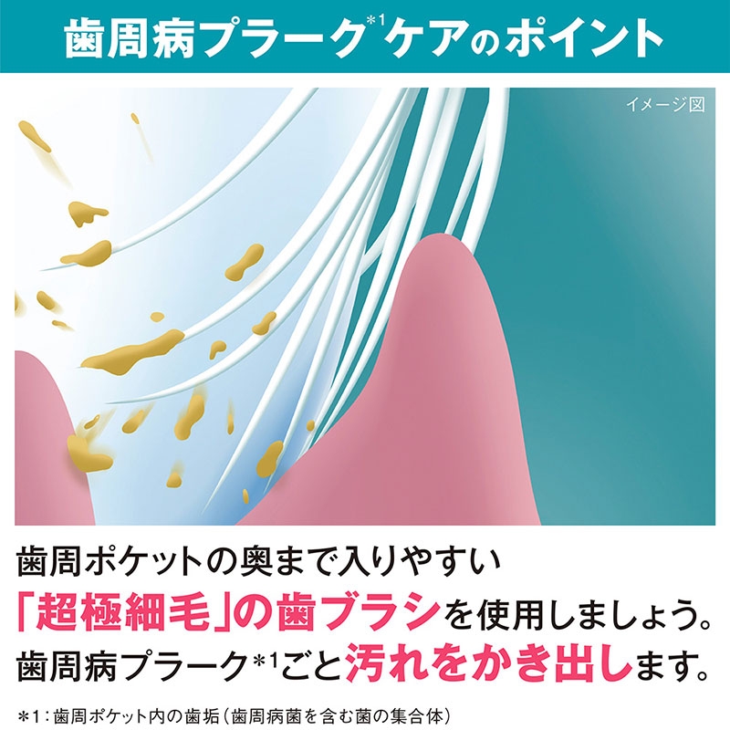 超極細毛が、歯周ポケットの奥の汚れを歯周病プラークごとごっそりかき出す、歯周病ケアのためのハブラシ。