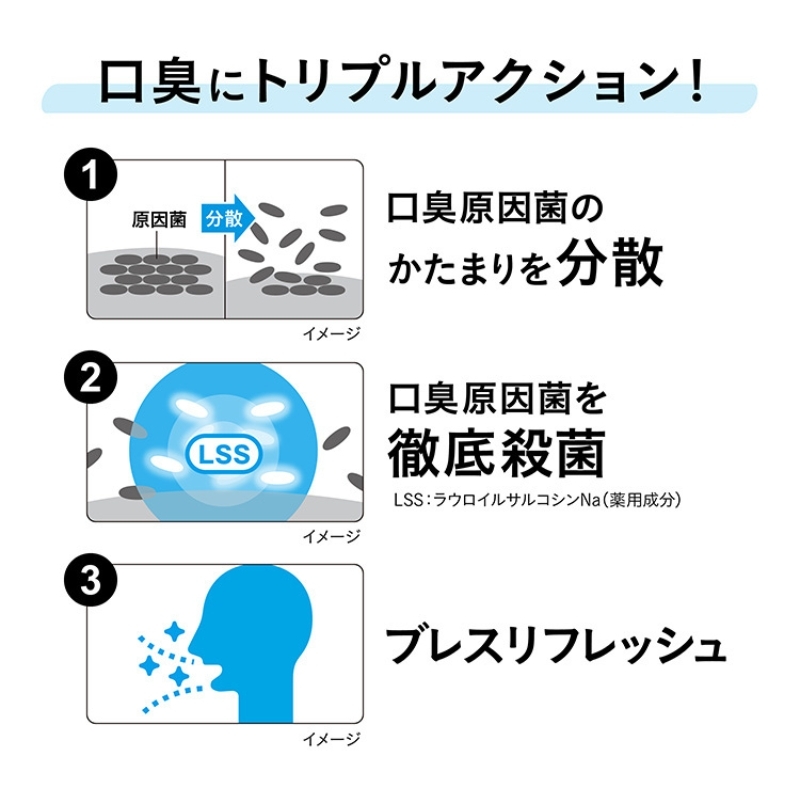 殺菌成分(LSS:ラウロイルサルコシンNa)が、口臭原因菌を徹底殺菌し、口臭の発生を防ぎます。