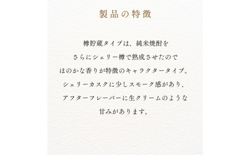 樽貯蔵は、純米焼酎をさらにシェリー樽で熟成させたので、ほのかな香りが特徴のキャラクタータイプ。