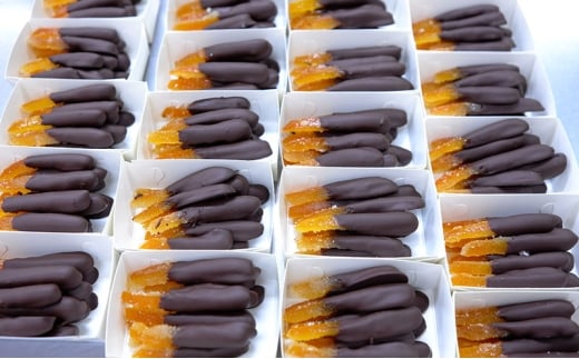 淡路特産の「鳴門オレンジ」の皮をじっくり蜜漬けにし、細切りにし砂糖を程よくまぶしたピールを職人が一本ずつ丁寧にベルギー産チョコレートでくるんだ長手長栄堂の自慢の逸品です。