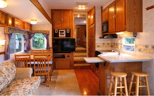 トレーラーハウスは禁煙、トイレ・シャワー・冷暖房・TV・冷蔵庫・IHコンロ・電子レンジ・電気ポット付。