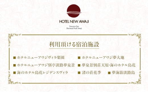 容量 | 洲本温泉 ホテルニューアワジグループでご利用頂ける利用券 30,000円分 【利用頂ける宿泊施設】 ・ホテルニューアワジヴィラ楽園 ・ホテルニューアワジ夢大地 ・ホテルニューアワジ別亭淡路夢泉景 ・夢泉景別荘天原・海のホテル島花 ・海のホテル島花レジデンスヴィラ ・渚の荘花季 ・夢海游淡路島 |