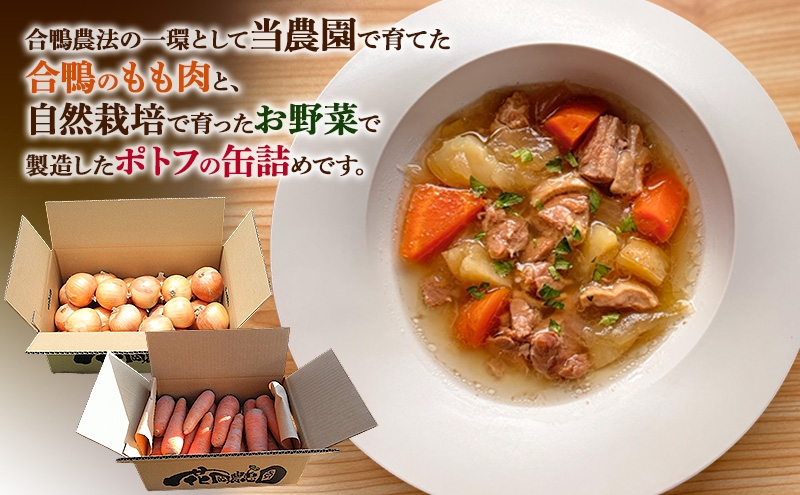 合鴨農法(合鴨水稲同時作)の一環として当農園の田んぼで育てた合鴨のもも肉と、栽培期間中 当農園にて無肥料・無農薬・自然栽培で育ったお野菜で製造したポトフの缶詰めです。