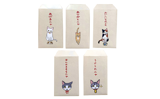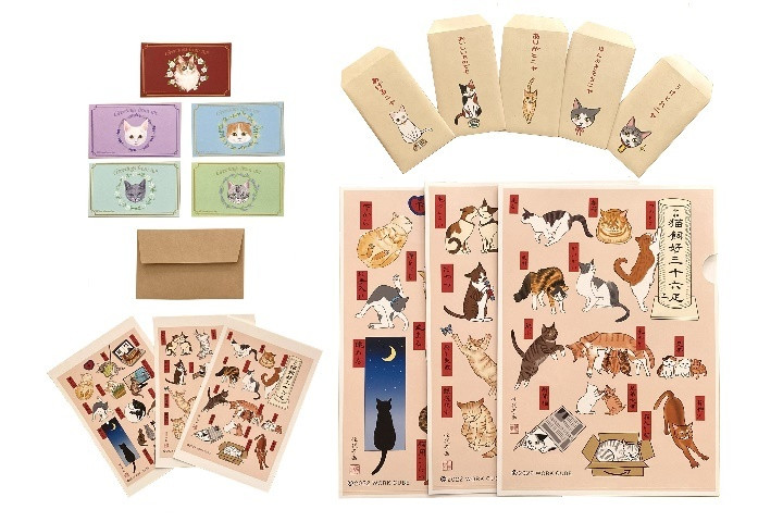 障害のあるイラストレーター作家の佳代子の作品。猫シリーズの文具を集めました。可愛いイラストのメッセージカード・ユニークなデザインのポチ袋・歌麻呂風の現代版浮世絵猫絵が描かれたポストカード・紙ファイルは環境に配慮した紙製のA4サイズファイル。
