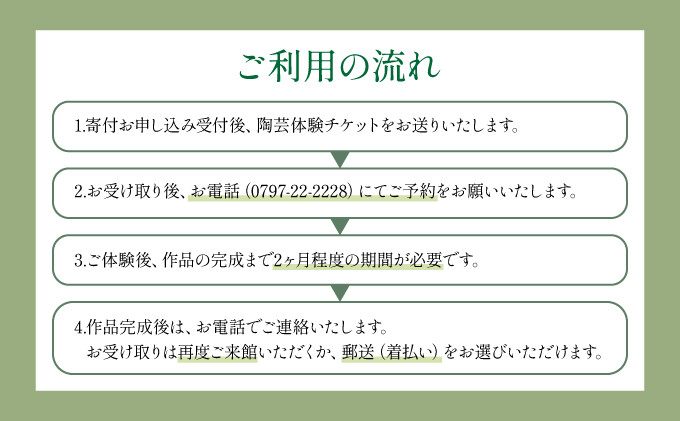 1.寄付お申し込み受付後、陶芸体験チケットをお送りいたします。