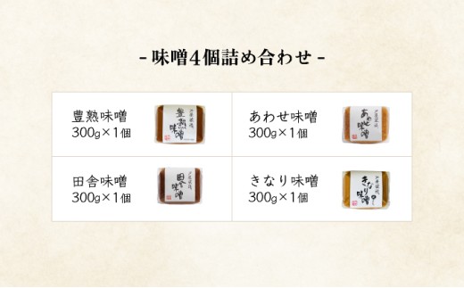 容量 | ■4個詰め合わせ:芦屋蔵造(豊熟味噌、田舎味噌、白味噌、きなり味噌)各300g×1個 ■6個詰め合わせ:芦屋蔵造(豊熟味噌、田舎味噌、白味噌、赤だし味噌、あわせ味噌、黒大豆味噌)各300g×1個 ■10個(9種)詰め合わせ:芦屋蔵造(豊熟味噌×2個、田舎味噌×1個、白味噌×1個、赤だし味噌×1個、あわせ味噌×1個、黒大豆味噌×1個)各300g、田楽味噌(木の芽、柚子、赤だし)各120g×1個 |