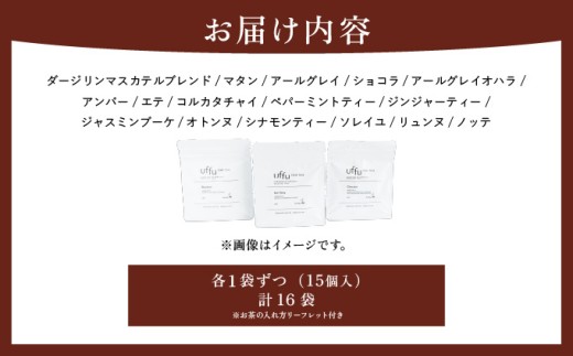 芦屋市生まれの紅茶のインポーター!世界から心からおいしいと感じた紅茶だけをお届け 紅茶 ティーバッグ 16種セット【Uf-fu ウーフ】茶葉 人気 ダージリンマスカテルブレンド マタン アールグレイ ショコラ アールグレイオハラ アンバー エテ コルカタチャイ ペパーミントティー ジンジャーティー ジャスミンブーケ オトンヌ シナモンティー ソレイユ リュンヌ ノッテ ミルクティー アイスティー ティータイム 詰め合わせ 贈り物 ギフト プレゼント
