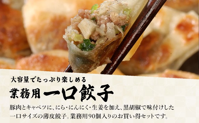 【一口餃子】豚肉とキャベツに、にら・にんにく・生姜を加え、黒胡椒で味付けし薄皮で包んだ一口サイズの餃子です。業務用一口餃子90個入りセットです。※袋詰めのため、餃子が割れている場合があります。