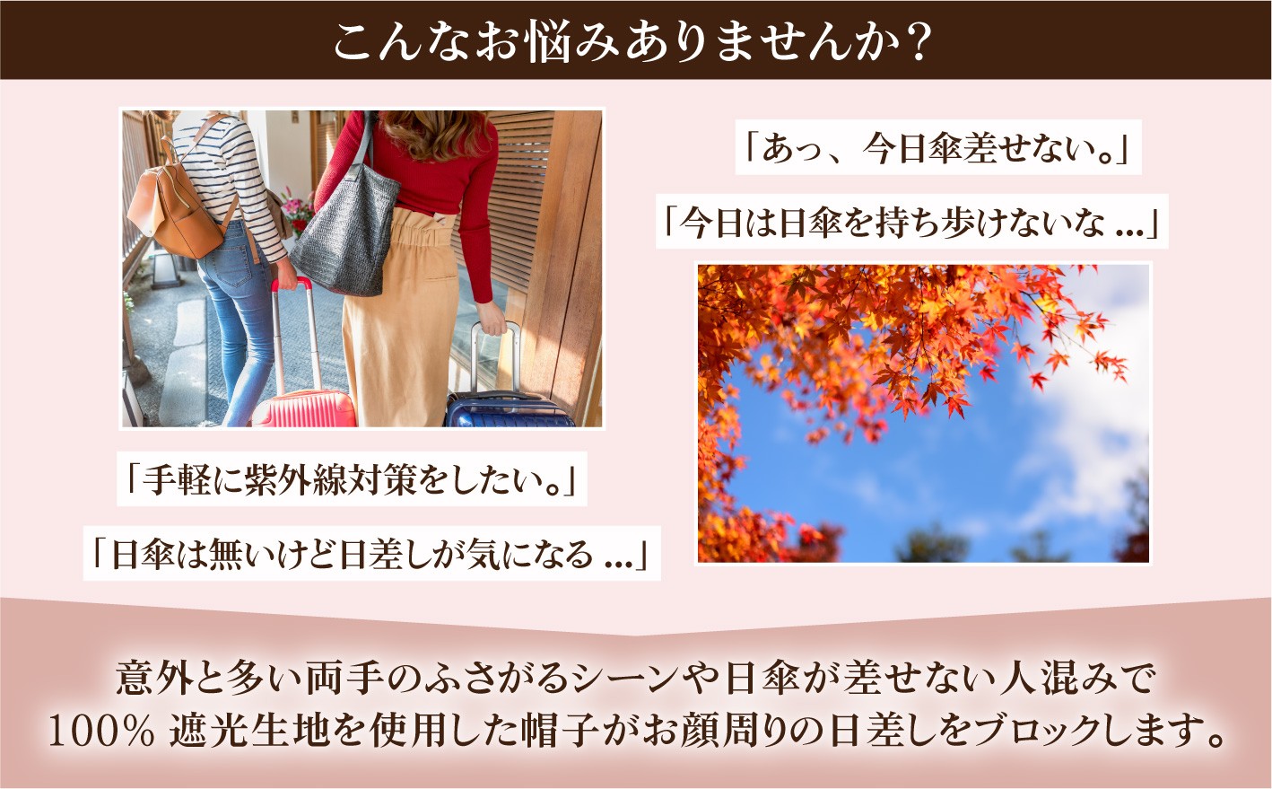 意外と多い両手の塞がるシーンや日傘が差せない人混みで、100%遮光生地を使用した帽子がお顔周りの日差しをブロックします。