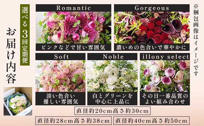 | 容量 | 生花の花束 【サイズ】 ・直径約20cm/高さ約30cm ・直径約28cm/高さ約38cm ・直径約40cm/高さ約50cm 【種類】 ・illony select (その日一番品質のよい組み合わせ) ・Romantic (ピンクなどで甘い雰囲気) ・Gorgeous (濃いめの色合いで華やかに) ・Soft (淡い色合いで優しい雰囲気) ・Noble (白とグリーンを中心に上品に) |