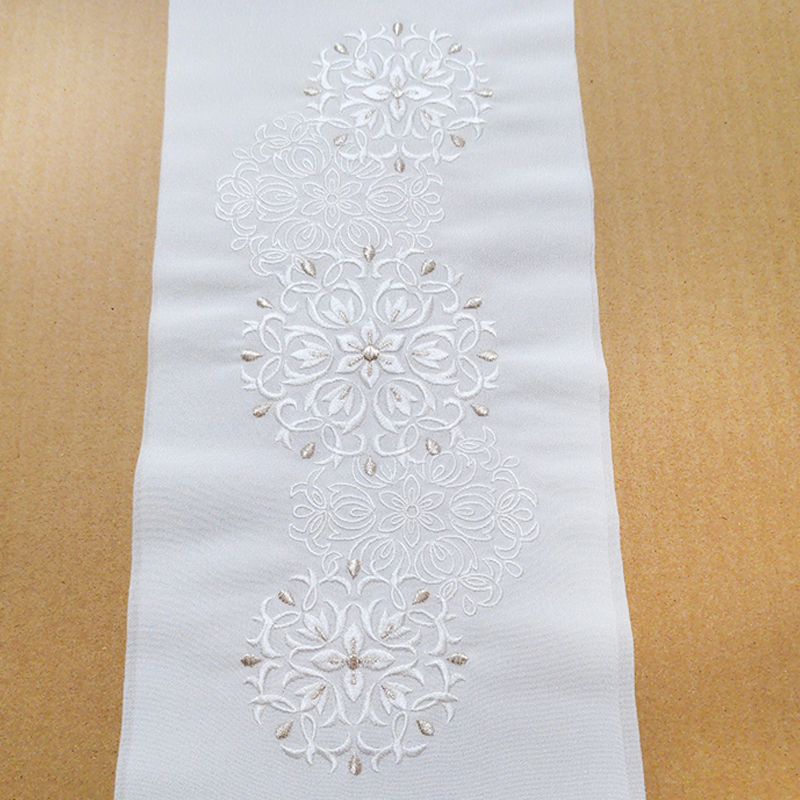 | 容量 | 半衿1点:白地に白とシルバーの華紋柄、刺繍 【サイズ】長さ105センチ×横巾15センチ 【素材】生地 ポリエステル100%、刺繍糸 レーヨン100% |