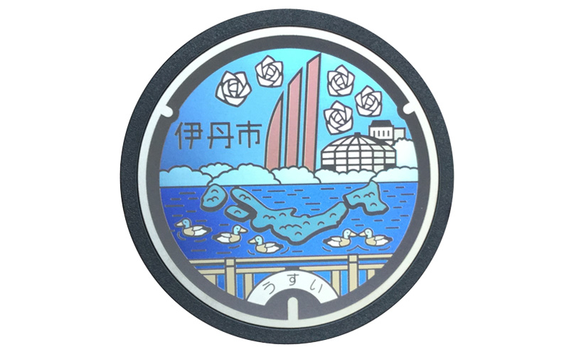 4. 「白鳥と昆陽池公園」…昆陽池公園の「白鳥」と市の鳥「カモ」が泳ぐ姿をデザインしたマンホールです。本マンホール蓋の製作に当たっては豊かな水環境を印象的に描くことにより伊丹市の快適な暮らしや循環型社会を支える下水道の貢献を表現しました。