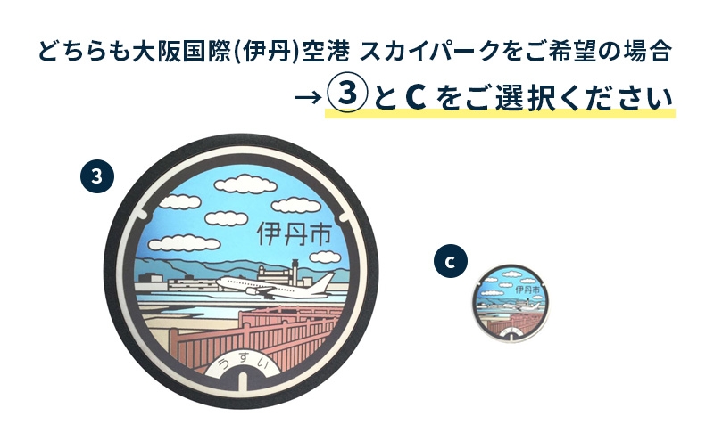 ※ミニチュアマンホールとメダルについて、それぞれ「旧岡田家 住宅・酒蔵」「昆陽池公園 昆虫館 荒牧バラ公園」「大阪国際(伊丹)空港 スカイパーク」「白鳥と昆陽池公園」の内から一つお選びください。(16種の組み合わせの中からご選択ください。)