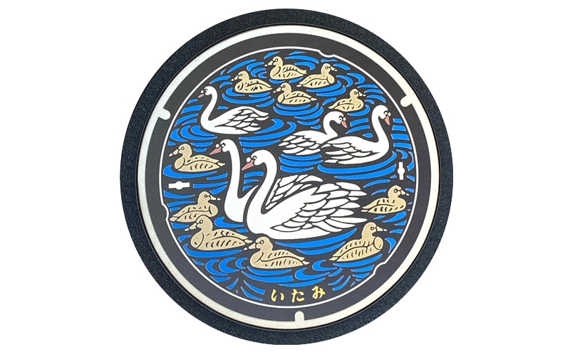 4. 「白鳥と昆陽池公園」…昆陽池公園の「白鳥」と市の鳥「カモ」が泳ぐ姿をデザインしたマンホールです。本マンホール蓋の製作に当たっては豊かな水環境を印象的に描くことにより伊丹市の快適な暮らしや循環型社会を支える下水道の貢献を表現しました。