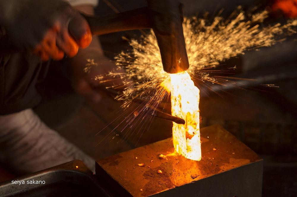 沸かしをかけた(溶ける寸前の)鋼を鍛造ハンマーで叩いていきます。