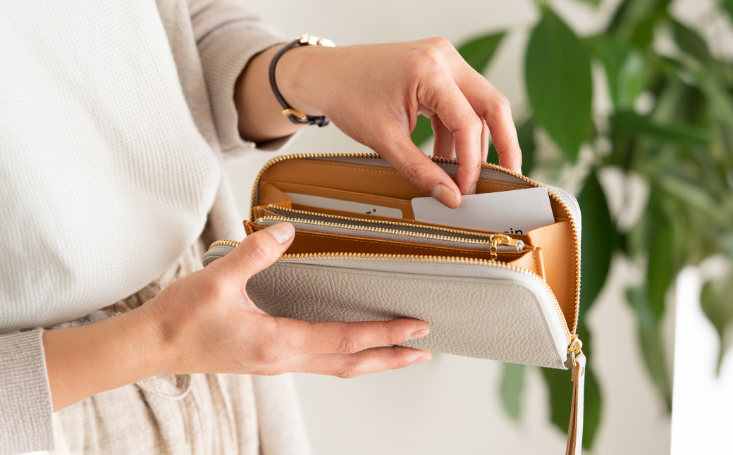 本体皮革はイタリアCOPAR社の職人による鮮やかな色付けと極め細やかな型押しで仕上げられています。よってキズが付きにくく、色落ちしにくいので扱いやすい財布です。同社工場の認定タグが付きます。ファスナーはYKKのEVERBRIGHTですので輝きを持続し耐食性にも優れスムースです。外装にカード入れ1、内装にはファスナー小銭入れ1、カード入れ8、領収書等入れが2です。