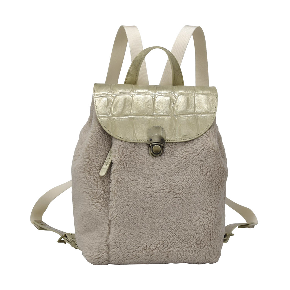 背中にコロンと可愛いサイズ感が絶妙なシープボアフリースのふんわりミニリュック。長財布が横にすっぽりと入る最適サイズ。本体は一枚の裁断パーツから出来ている。裁断クズが極限に少ないことで地球に優しい。縫う箇所が少ないことで生産者に優しい生産性の良さ。縫い目からほどける心配も少ないから「強い」。その製法から独特の柔らかいシルエットと優しいフォルムが出ている。革は、パプリカ型押しのゴールドの上にベージュで手汚しして、控えめなメタリック感を出している。本体のフリースとの相反するメタリック感のある型押し革とのコンビネーションが面白い。秋冬のボア素材のマストアイテムとして活躍するリュックです。軽量なので旅行にも買い物にも最適です。